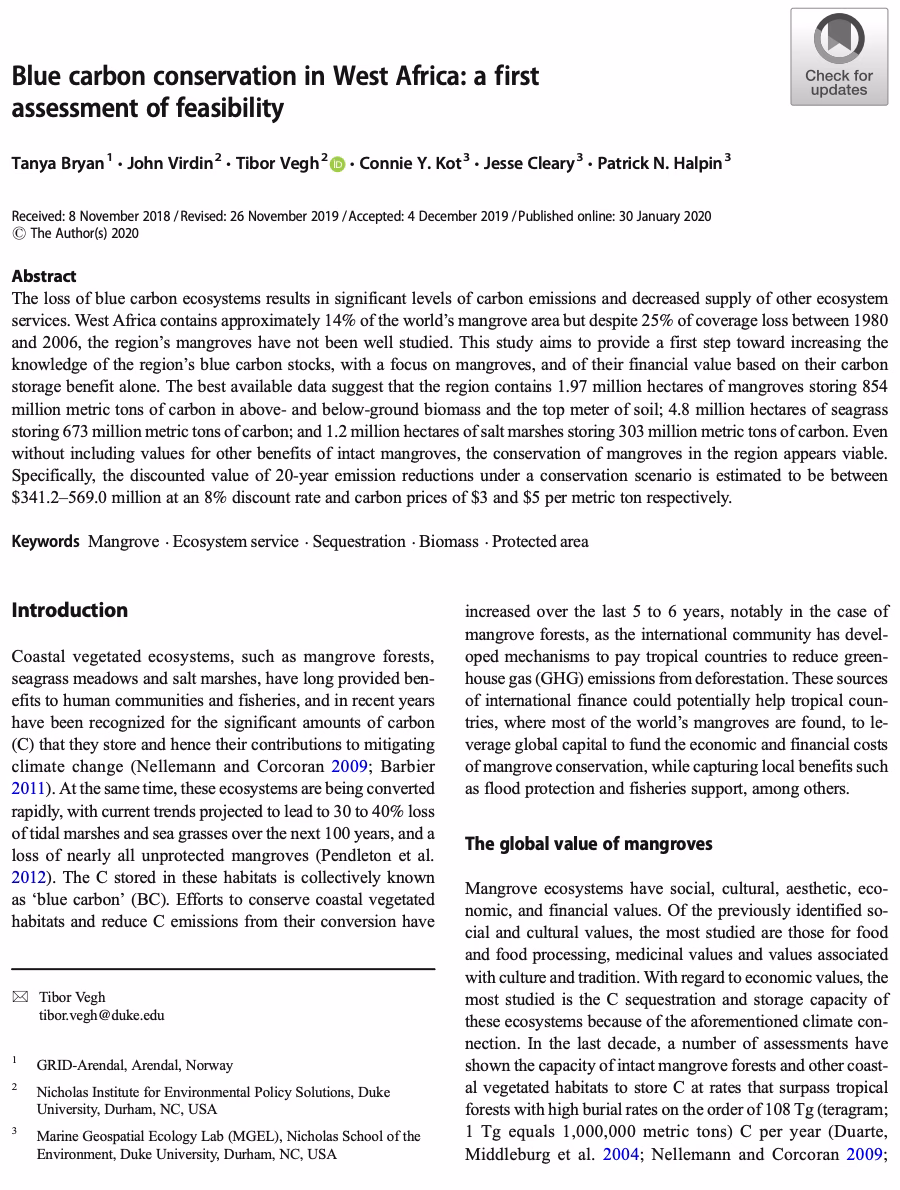 The loss of blue carbon ecosystems results in significant levels of carbon emissions and decreased supply of other ecosystem services. West Africa contains approximately 14% of the world’s mangrove area but despite 25% of coverage loss between 1980 and 2006, the region’s mangroves have not been well studied. This study aims to provide a first step toward increasing the knowledge of the region’s blue carbon stocks, with a focus on mangroves, and of their financial value based on their carbon storage benefit alone. The best available data suggest that the region contains 1.97 million hectares of mangroves storing 854 million metric tons of carbon in above- and below-ground biomass and the top meter of soil; 4.8 million hectares of seagrass storing 673 million metric tons of carbon; and 1.2 million hectares of salt marshes storing 303 million metric tons of carbon. Even without including values for other benefits of intact mangroves, the conservation of mangroves in the region appears viable. Specifically, the discounted value of 20-year emission reductions under a conservation scenario is estimated to be between $341.2–569.0 million at an 8% discount rate and carbon prices of $3 and $5 per metric ton respectively.