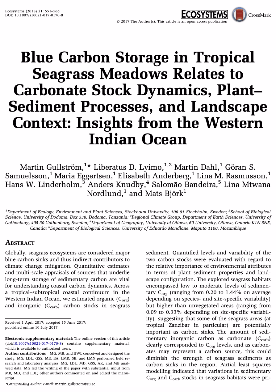 Blue Carbon Storage in Tropical Seagrass Meadows Relates to Carbonate Stock Dynamics, Plant–Sediment Processes, and Landscape Context: Insights from the Western Indian Ocean