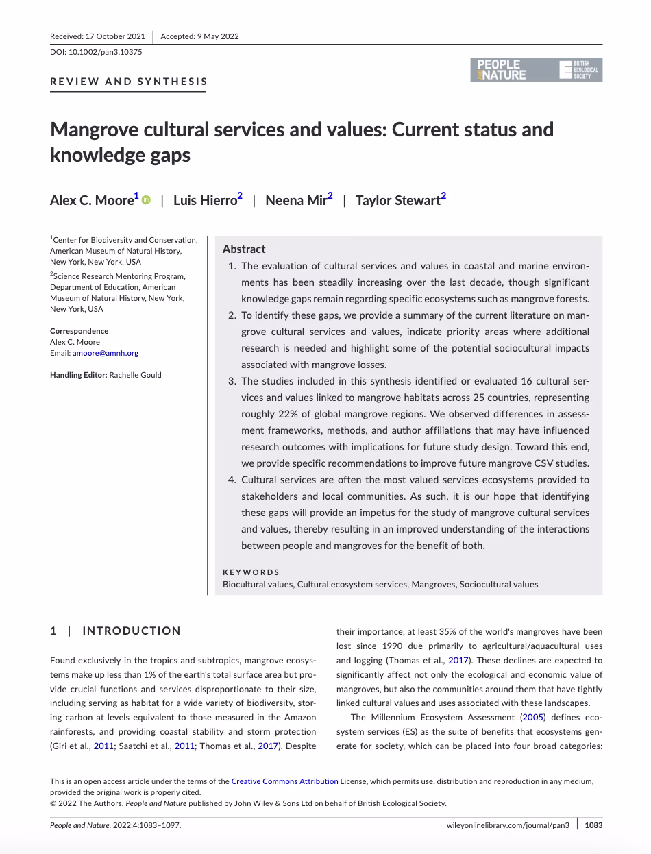 The evaluation of cultural services and values in coastal and marine environments has been steadily increasing over the last decade, though significant knowledge gaps remain regarding specific ecosystems such as mangrove forests.