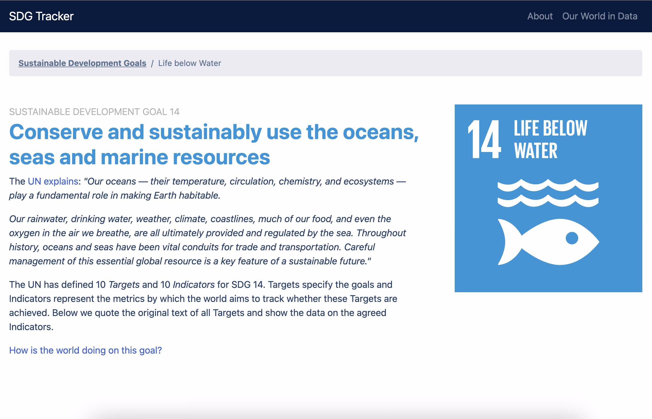 The goal of SDG 14 – Life Below Water is to conserve and sustainably use the oceans, seas and marine resources. The UN has defined 10 Targets and 10 Indicators for SDG 14. Targets specify the goals and Indicators represent the metrics by which the world aims to track whether these Targets are achieved.