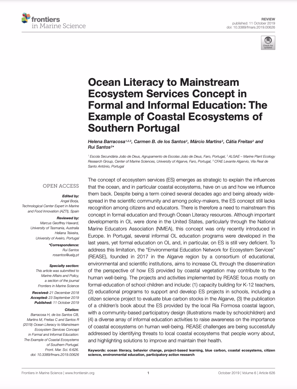 The concept of ecosystem services (ES) emerges as strategic to explain the influences that the ocean, and in particular coastal ecosystems, have on us and how we influence them back. Despite being a term coined several decades ago and being already wide-spread in the scientific community and among policy-makers, the ES concept still lacks recognition among citizens and educators. There is therefore a need to mainstream this concept in formal education and through Ocean Literacy resources.
