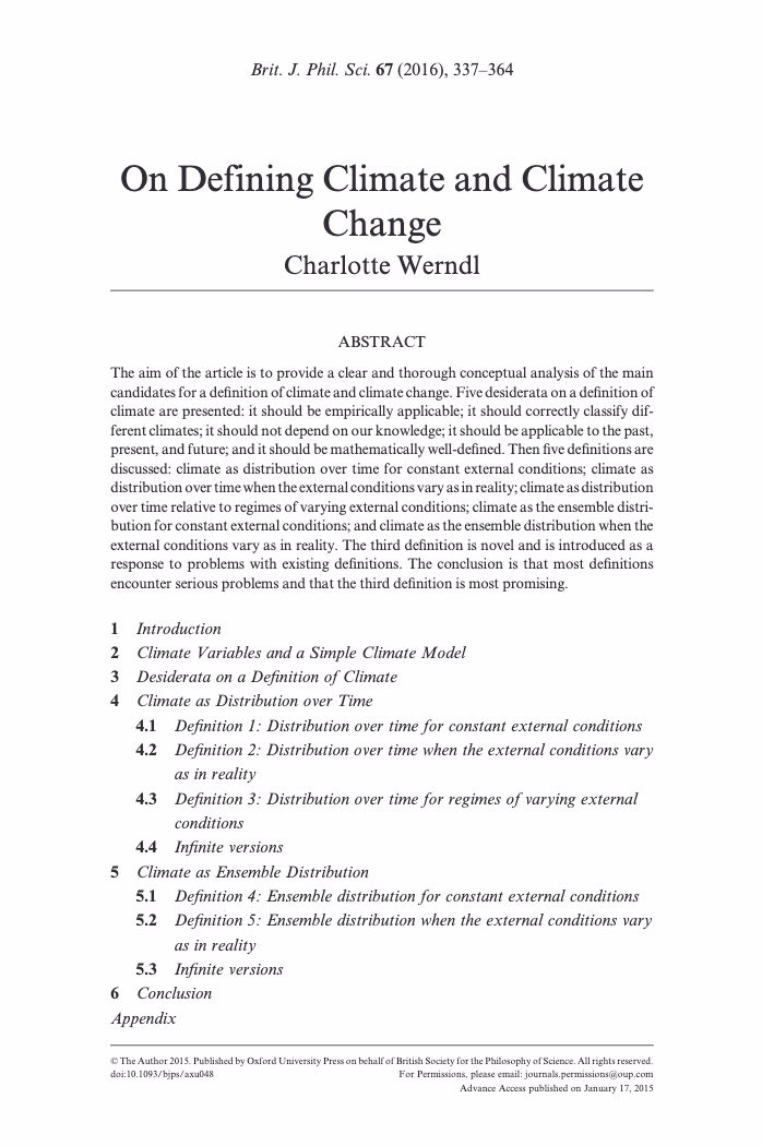 The aim of the article is to provide a clear and thorough conceptual analysis of the maincandidates for a definition of climate and climate change.