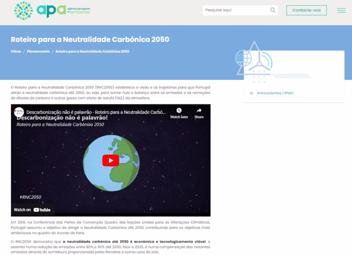 O Roteiro para a Neutralidade Carbónica 2050 (RNC2050) estabelece a visão e as trajetórias para que Portugal atinja a neutralidade carbónica até 2050, ou seja, para tornar nulo o balanço entre as emissões e as remoções de dióxido de carbono e outros gases com efeito de estufa (GEE) da atmosfera.