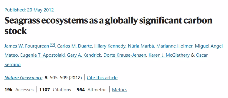 The protection of organic carbon stored in forests is considered as an important method for mitigating climate change. Like terrestrial ecosystems, coastal ecosystems store large amounts of carbon, and there are initiatives to protect these ‘blue carbon’ stores. Organic carbon stocks in tidal salt marshes and mangroves have been estimated, but uncertainties in the stores of seagrass meadows—some of the most productive ecosystems on Earth—hinder the application of marine carbon conservation schemes. Here, we compile published and unpublished measurements of the organic carbon content of living seagrass biomass and underlying soils in 946 distinct seagrass meadows across the globe. Using only data from sites for which full inventories exist, we estimate that, globally, seagrass ecosystems could store as much as 19.9 Pg organic carbon; according to a more conservative approach, in which we incorporate more data from surface soils and depth-dependent declines in soil carbon stocks, we estimate that the seagrass carbon pool lies between 4.2 and 8.4 Pg carbon. We estimate that present rates of seagrass loss could result in the release of up to 299 Tg carbon per year, assuming that all of the organic carbon in seagrass biomass and the top metre of soils is remineralized.