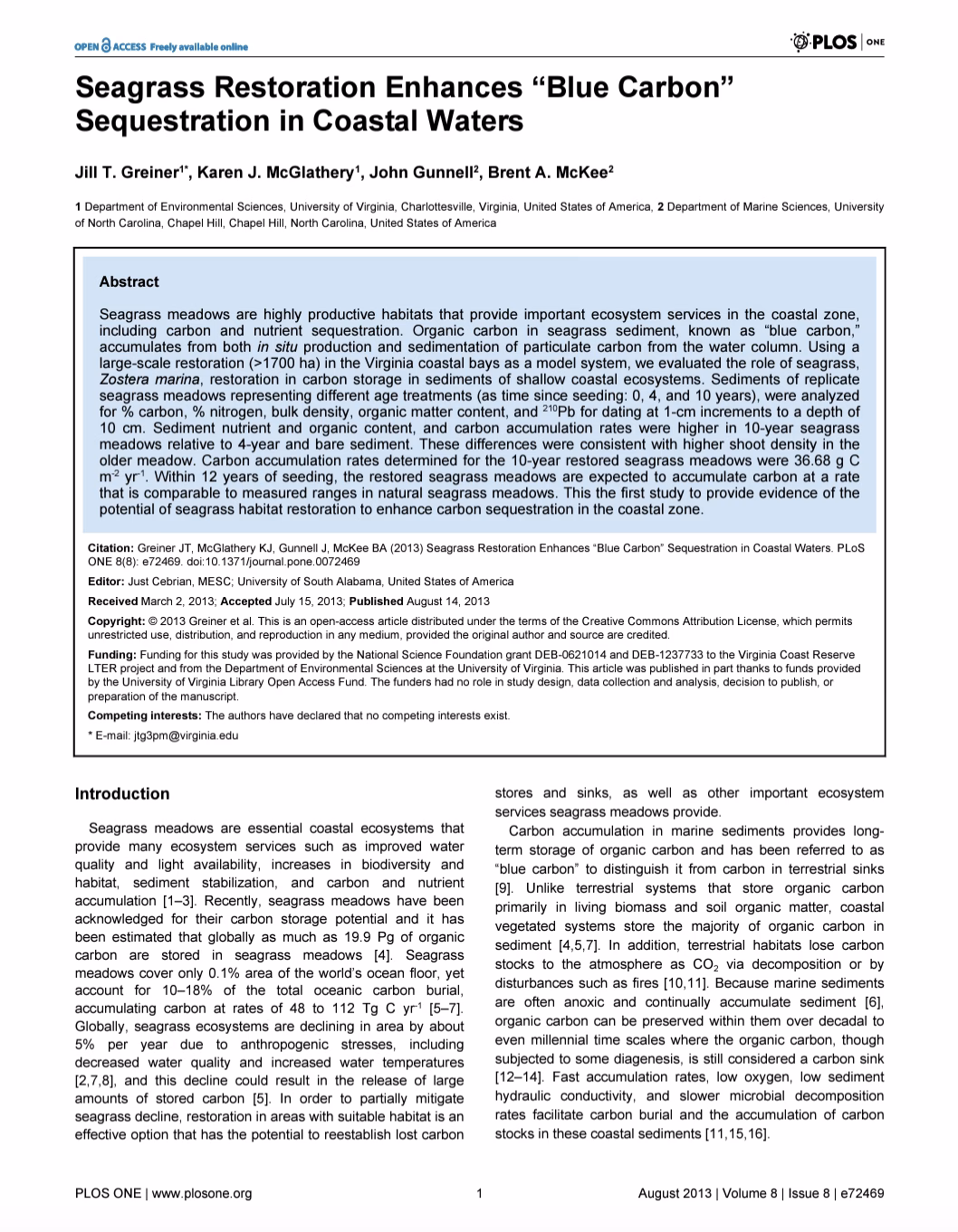 Seagrass meadows are highly productive habitats that provide important ecosystem services in the coastal zone, including carbon and nutrient sequestration. Organic carbon in seagrass sediment, known as “blue carbon,” accumulates from both in situ production and sedimentation of particulate carbon from the water column. Using a large-scale restoration (>1700 ha) in the Virginia coastal bays as a model system, authors evaluated the role of seagrass, Zostera marina, restoration in carbon storage in sediments of shallow coastal ecosystems. Sediments of replicate seagrass meadows representing different age treatments (as time since seeding: 0, 4, and 10 years), were analyzed for % carbon, % nitrogen, bulk density, organic matter content, and 210Pb for dating at 1-cm increments to a depth of 10 cm. Sediment nutrient and organic content, and carbon accumulation rates were higher in 10-year seagrass meadows relative to 4-year and bare sediment. These differences were consistent with higher shoot density in the older meadow. Carbon accumulation rates determined for the 10-year restored seagrass meadows were 36.68 g C m-2 yr-1. Within 12 years of seeding, the restored seagrass meadows are expected to accumulate carbon at a rate that is comparable to measured ranges in natural seagrass meadows. This the first study to provide evidence of the potential of seagrass habitat restoration to enhance carbon sequestration in the coastal zone.
