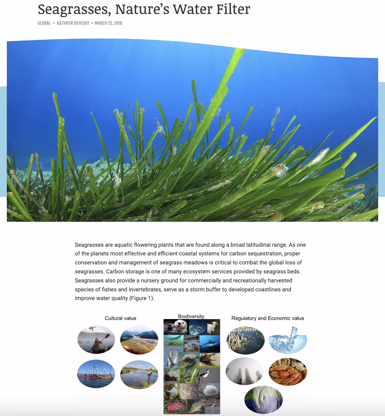 In many systems, vegetated estuarine habitats such as salt marshes and seagrass beds act as a natural water filtration system—where sediment and nutrient-rich water flows in and cleaner water flows out. Seagrasses are capable of both increasing the pH and concentration of dissolved oxygen in the water overlying the seagrass.