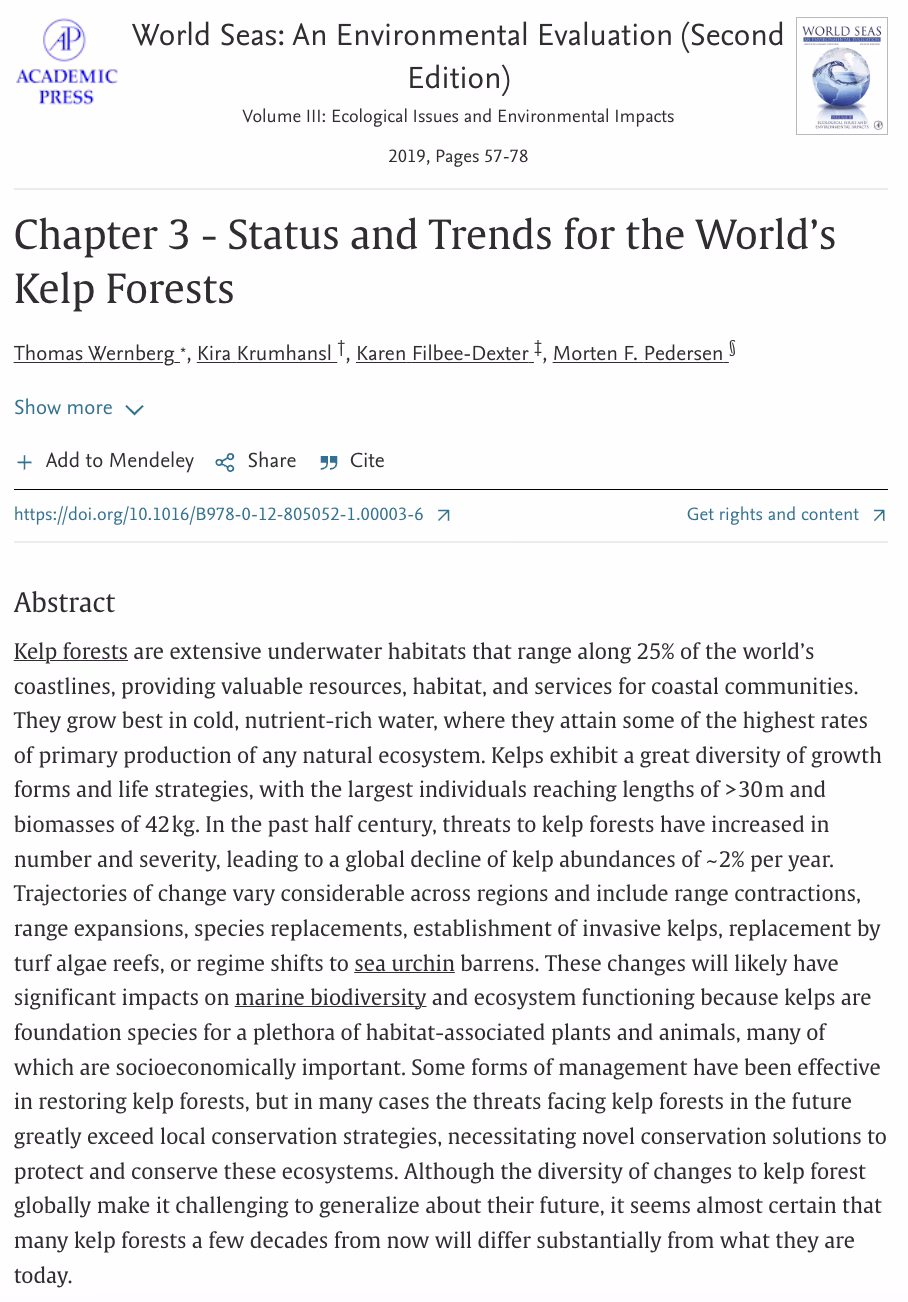 Kelp forests are extensive underwater habitats that range along 25% of the world’s coastlines, providing valuable resources, habitat, and services for coastal communities. They grow best in cold, nutrient-rich water, where they attain some of the highest rates of primary production of any natural ecosystem. Kelps exhibit a great diversity of growth forms and life strategies, with the largest individuals reaching lengths of > 30 m and biomasses of 42 kg. In the past half century, threats to kelp forests have increased in number and severity, leading to a global decline of kelp abundances of ~ 2% per year. Trajectories of change vary considerable across regions and include range contractions, range expansions, species replacements, establishment of invasive kelps, replacement by turf algae reefs, or regime shifts to sea urchin barrens. These changes will likely have significant impacts on marine biodiversity and ecosystem functioning because kelps are foundation species for a plethora of habitat-associated plants and animals, many of which are socioeconomically important. Some forms of management have been effective in restoring kelp forests, but in many cases the threats facing kelp forests in the future greatly exceed local conservation strategies, necessitating novel conservation solutions to protect and conserve these ecosystems. Although the diversity of changes to kelp forest globally make it challenging to generalize about their future, it seems almost certain that many kelp forests a few decades from now will differ substantially from what they are today.