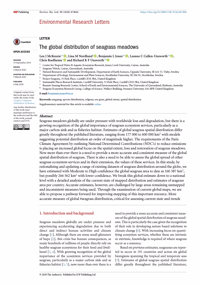 Seagrass meadows globally are under pressure with worldwide loss and degradation, but there is a growing recognition of the global importance of seagrass ecosystem services, particularly as a major carbon sink and as fisheries habitat. Estimates of global seagrass spatial distribution differ greatly throughout the published literature, ranging from 177 000 to 600 000 km2 with models suggesting potential distribution an order of magnitude higher.