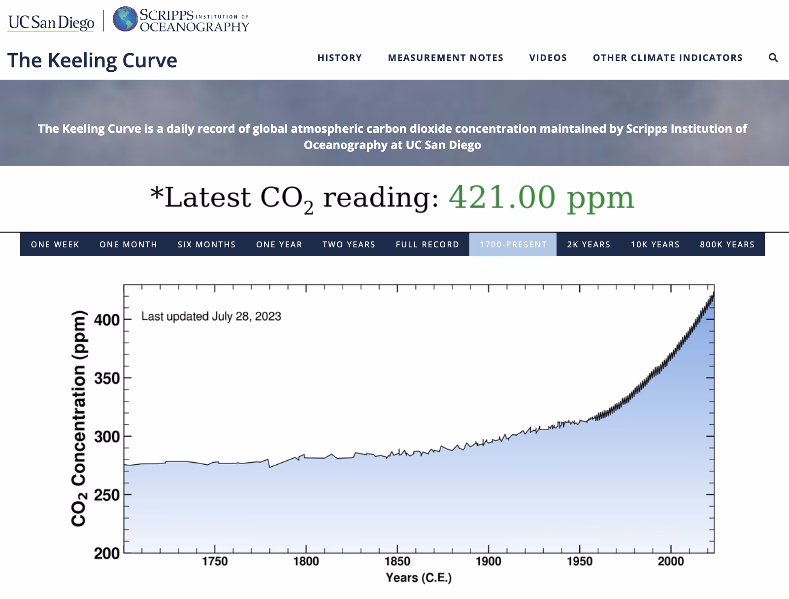 The Keeling Curve is a daily record of global atmospheric carbon dioxide concentration maintained by Scripps Institution of Oceanography at UC San Diego. Scripps CO2 measurements at Mauna Loa have been supported for many years by the U.S. Department of Energy (DOE), and have more recently been supplemented by Earth Networks, a technology company collaborating with Scripps to expand the global GHG monitoring network. Support for website development was provided in part by the National Science Foundation (NSF). Any opinions, findings, and conclusions or recommendations expressed in this material are those of the authors and do not necessarily reflect the views of NSF.