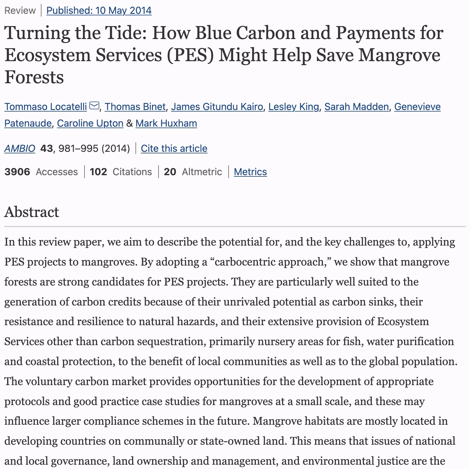 In this review paper, the authors aim to describe the potential for, and the key challenges to, applying Payment for Ecosystem (PES) projects to mangroves. By adopting a “carbocentric approach,” the authors show that mangrove forests are strong candidates for PES projects.