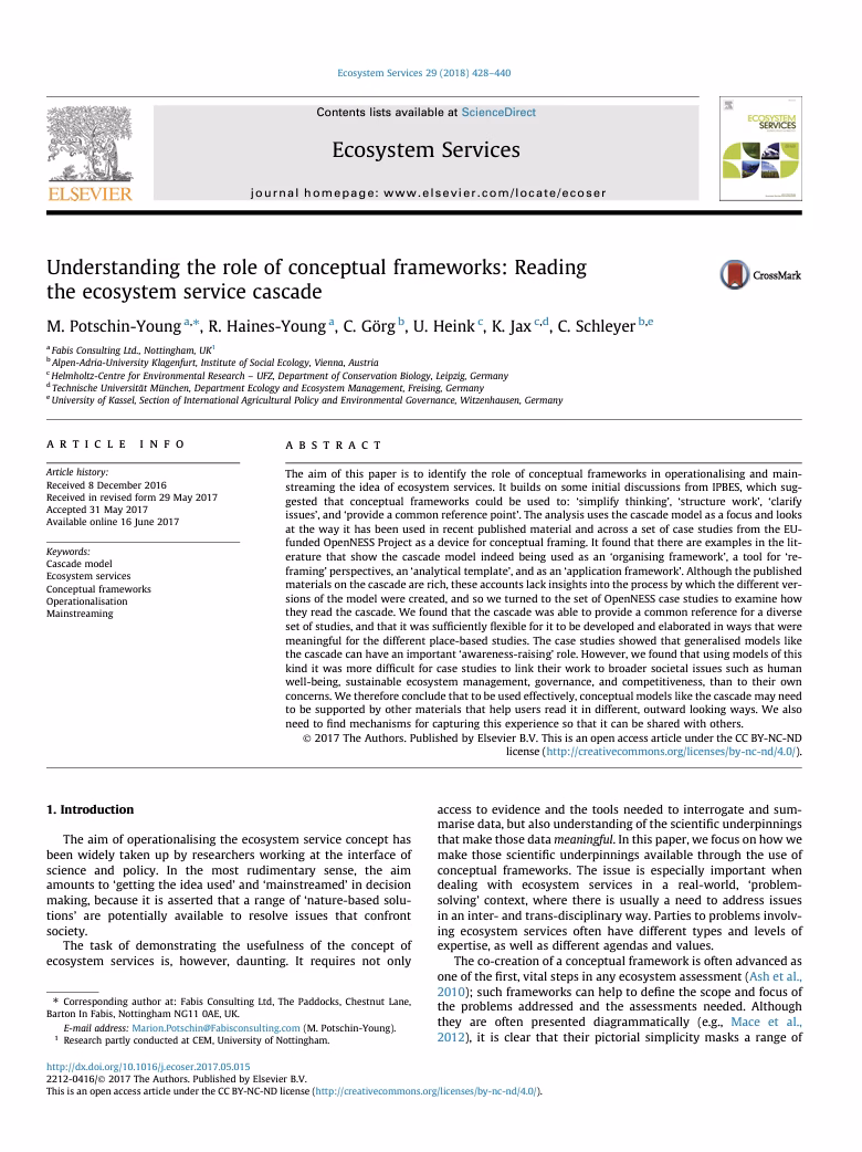 The aim of this paper is to identify the role of conceptual frameworks in operationalising and mainstreaming the idea of ecosystem services. It builds on some initial discussions from IPBES, which suggested that conceptual frameworks could be used to: ‘simplify thinking’, ‘structure work’, ‘clarify issues’, and ‘provide a common reference point’. The analysis uses the cascade model as a focus and looks at the way it has been used in recent published material and across a set of case studies from the EU-funded OpenNESS Project as a device for conceptual framing.