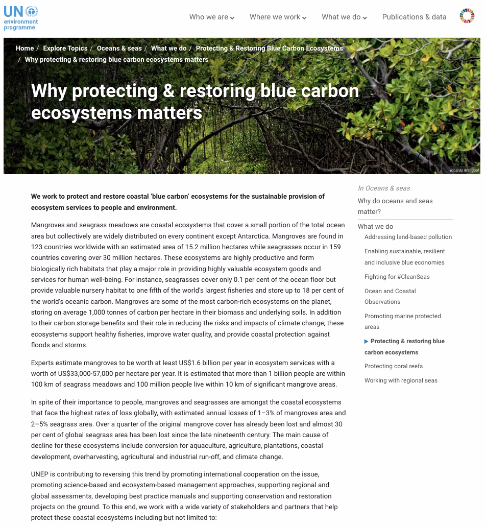 Mangroves and seagrass meadows are coastal ecosystems that cover a small portion of the total ocean area but collectively are widely distributed on every continent except Antarctica. Mangroves are found in 123 countries worldwide with an estimated area of 15.2 million hectares while seagrasses occur in 159 countries covering over 30 million hectares. These ecosystems are highly productive and form biologically rich habitats that play a major role in providing highly valuable ecosystem goods and services for human well-being. In spite of their importance to people, mangroves and seagrasses are amongst the coastal ecosystems that face the highest rates of loss globally, with estimated annual losses of 1–3% of mangroves area and 2–5% seagrass area. Over a quarter of the original mangrove cover has already been lost and almost 30 per cent of global seagrass area has been lost since the late nineteenth century.
